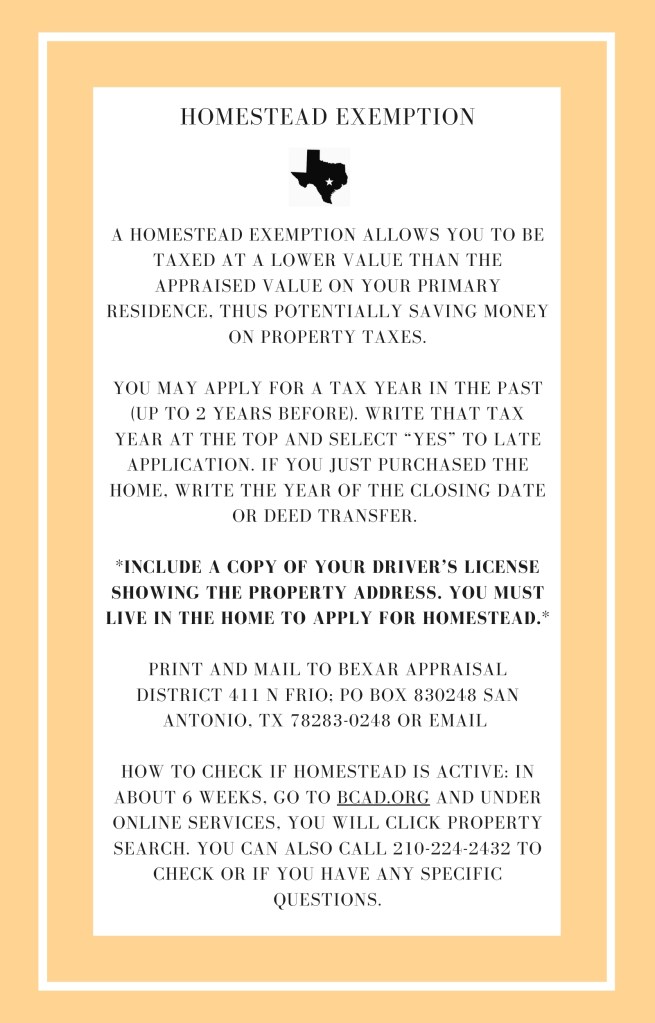 Link to Homestead Application (Bexar County): https://bcad.org/wp-content/uploads/2023/10/2023_50-114-HS-Fillable.pdf